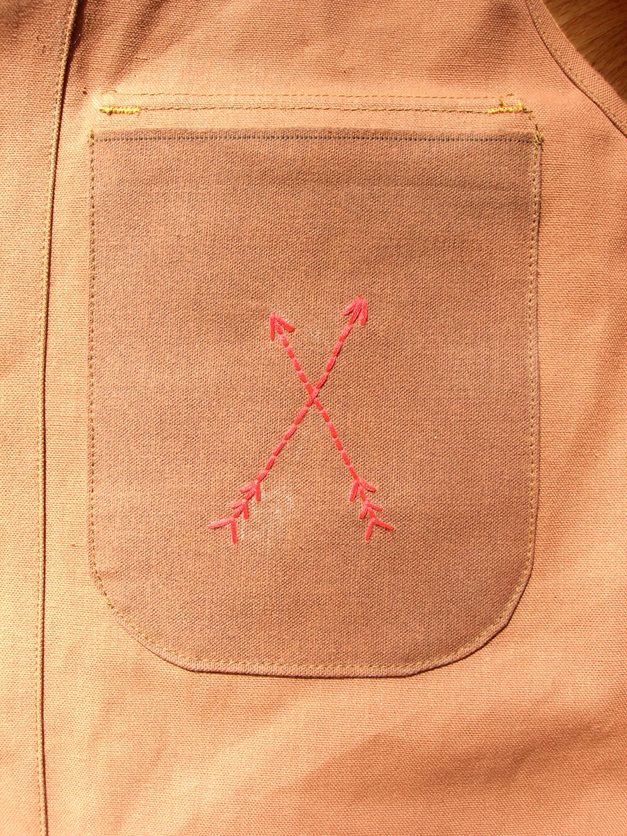 Ingredients: selvedge canvas from Cone Mills, hand-waxed canvas details using Otter Wax, hand-embroidered arrows, hand-stamped leather tag, "japanned" black reproduction buckle.